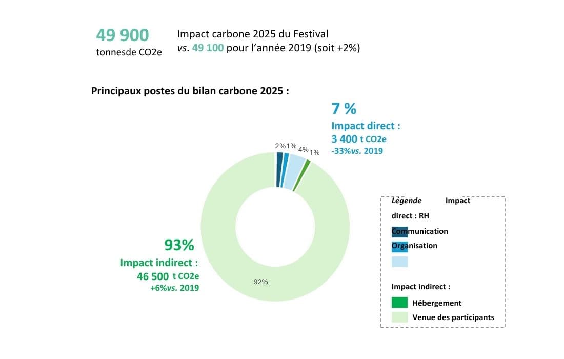 Cet objectif pourra être atteint grâce en particulier à un travail rigoureux sur les deux postes principaux de son empreinte environnementale : l’empreinte liée au nombre et au voyage des participants venant jusqu’à Cannes (environ 90% de l’empreinte du Festival en 2019) et l‘empreinte liée aux aménagements et équipements (5,5% de l’empreinte du Festival en 2019).